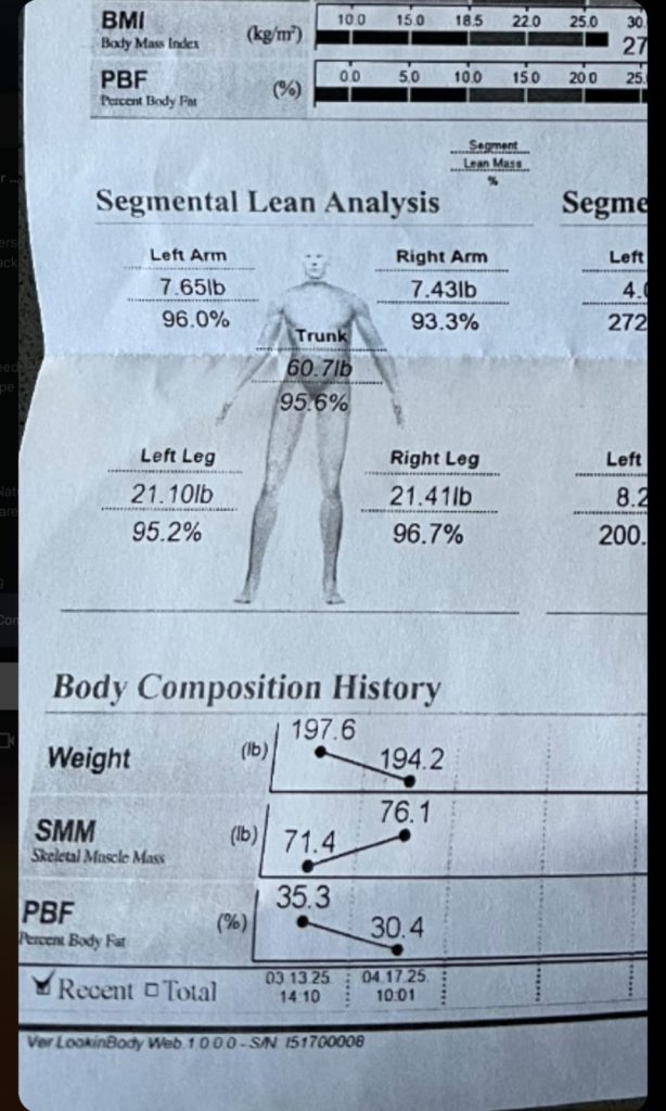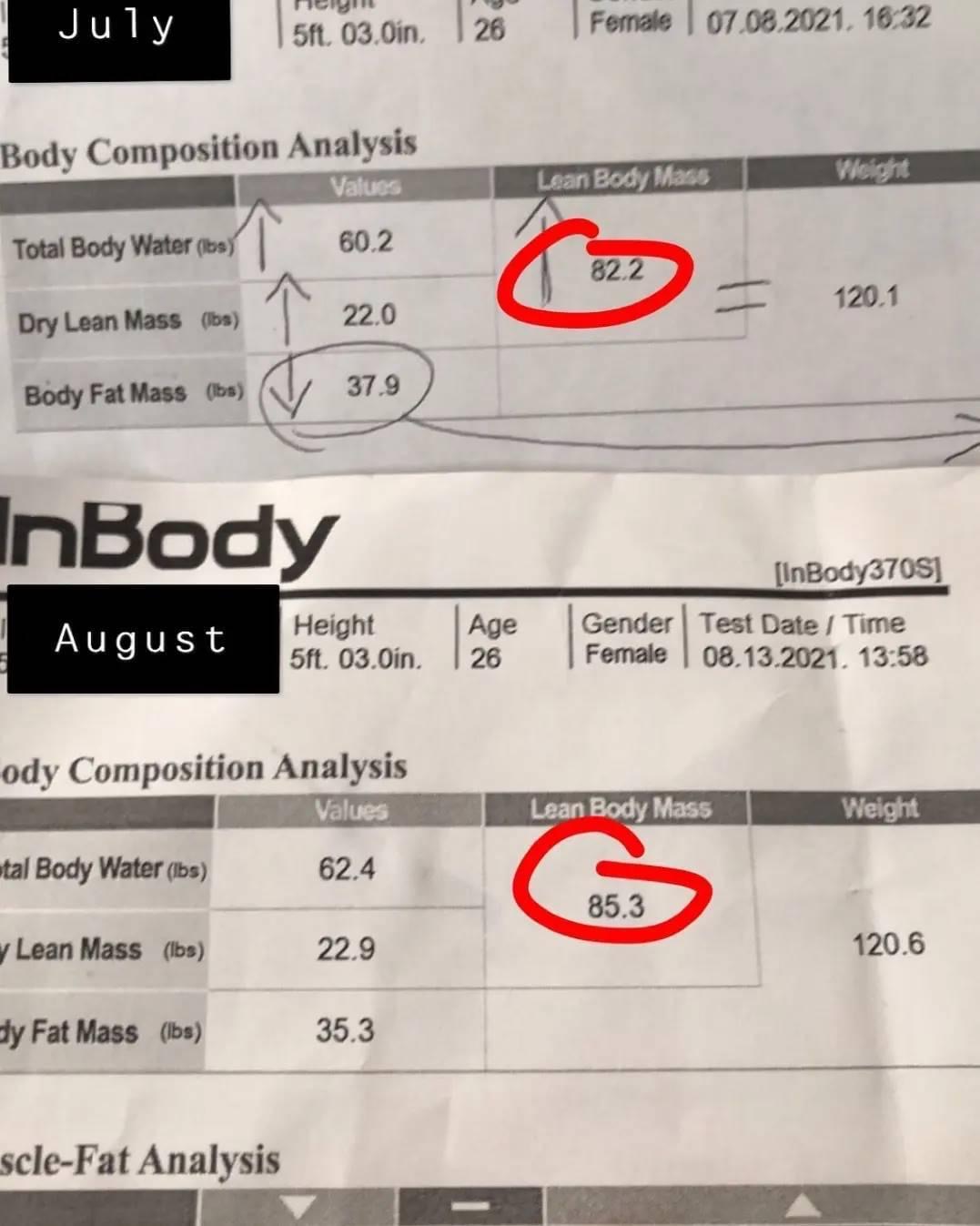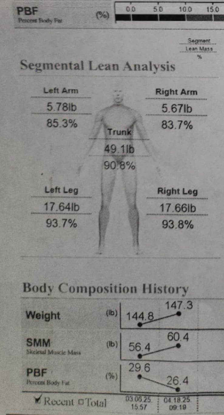 Down 3.2 lbs of fat UP 4 lbs of muscle.