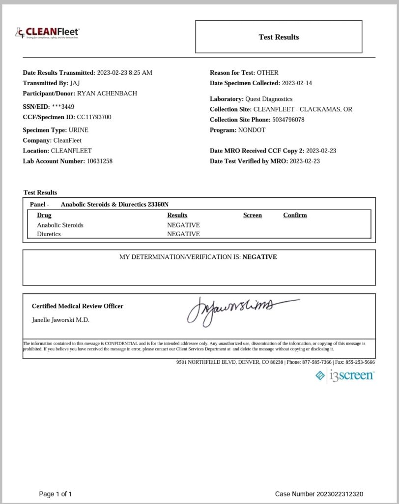 Negative Steroid test. I only compete in Drug Test powerlifting